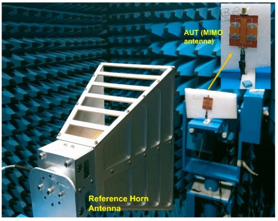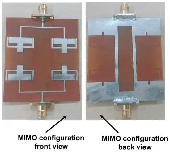 The suggested MIMO antenna prototype is provided in Figure 19. The antenna holds a measured bandwidth of 3.6–3.8 GHz and 5.65–5.95 GHz with a resonance of 3.75 GHz and 5.9 GHz, respectively. There is a negligible shift in the first resonance of the proposed antenna due to cable losses. Figure 20 displays the proposed MIMO array antenna’s measured scattering properties.