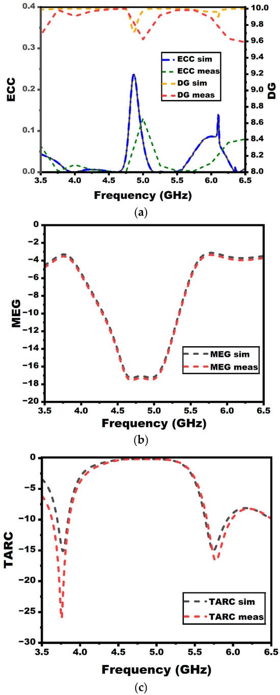 MIMO diversity parameters: (a) ECC and DG, (b) MEG, and (c) TARC.