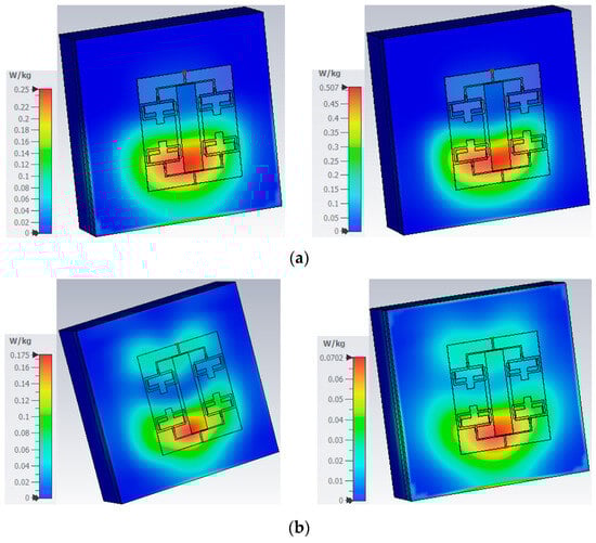SAR values at (a) 3.75 GHz and (b) 5.9 GHz.