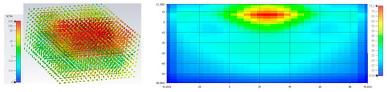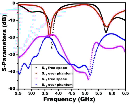 The scattering properties of the proposed antenna over the phantom are displayed in Figure 27. As depicted in the figure, there is a slight shift in the resonant frequency of the antenna towards the first band due to the dielectric properties of the tissues. However, the antenna still maintains the operational bandwidth, as indicated in the figure. The E-field at 3.77 GHz and the SAR value accompanied by the internal field along the depth region are given in Figure 28.