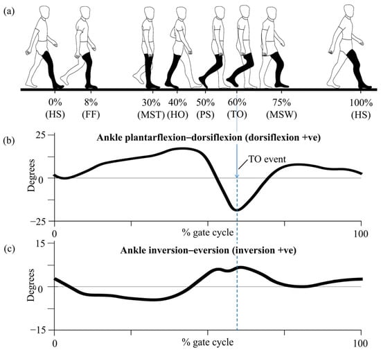 In the sagittal plane, the cycle begins at HS, where the ankle is positioned in slight plantarflexion to absorb ground reaction forces. As the foot transitions to an FF position, the ankle moves into dorsiflexion, enabling shock absorption and body weight acceptance. During MST, dorsiflexion continues as the body’s center of mass shifts forward over the supporting foot. Toward the end of the stance phase, the ankle initiates plantarflexion, reaching its peak at the TO event, which generates the propulsive force required for forward progression. During the swing phase, the ankle returns to dorsiflexion to achieve ground clearance and then transitions into slight plantarflexion in preparation for the next HS (see Figure 2b) [36].