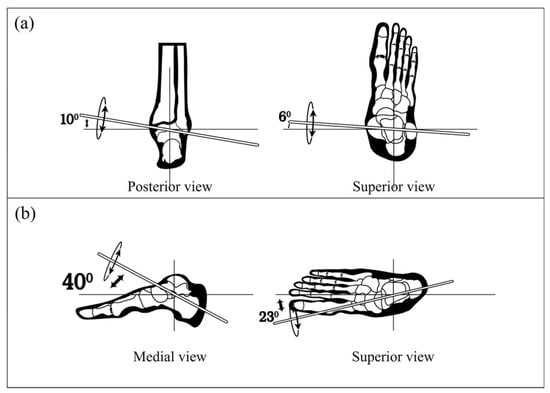 Oblique orientation of the rotational axes in ankle joint complex illustrating their multi-planar contributions to ankle joint motion: (a) the talocrural joint; (b) the subtalar joint.