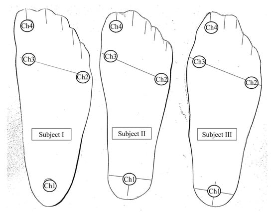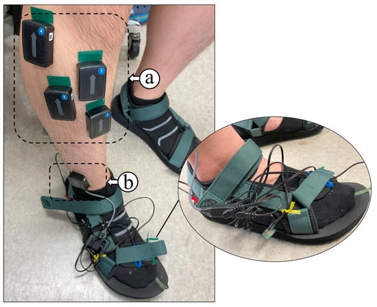 Each Delsys surface EMG sensor featured a compact body size of 27 × 37 × 13 mm and a mass of 14 g, offering a lightweight and unobtrusive profile suitable for gait trials. The surface EMG signals were acquired at a sampling rate of 1926 samples/s, with a bandwidth ranging from 20 to 450 Hz, enabling high-fidelity recording of muscle activation patterns during dynamic activities. The four-channel FSR system, integrated into a customized wearable sandal, was used to capture localized plantar pressure values beneath the heel, midfoot, and toe regions. Individual adjustments were made to the sandal structure for each participant to ensure the proper alignment of the FSR membranes with anatomical landmarks of the foot (see Figure 5).