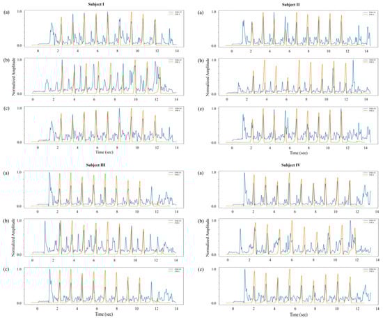 Comparison of representative normalized EMG envelopes (blue) with interpolated FSR channel 4 (toe region) outputs (orange) for subjects I–IV: (a) EMG sensor 2 positioned over the FL; (b) EMG sensor 3 over the SOL; (c) EMG sensor 4 over the GA muscle.
