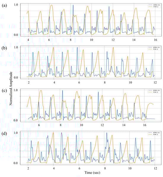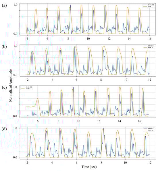 Comparison of normalized EMG signals (blue) from sensor 1 placed over the TA muscle with interpolated FSR channel 1 outputs (orange) from the heel region for dorsiflexion analysis. Subplots (a–d) correspond to subjects I–IV, respectively.