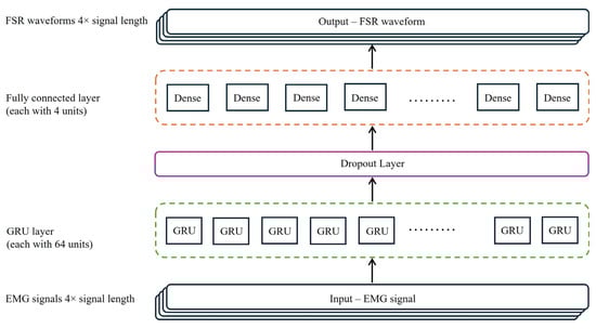 The overall architecture of the proposed GRU-based predictive model, designed to map EMG signal features to FSR pressure outputs, is depicted in Figure 9. A detailed summary of the layer configuration and parameter distribution is provided in Table 1. The model comprises a total of 13,700 trainable parameters with no non-trainable parameters. This compact and efficient structure balances learning capacity with computational demands, facilitating real-time application potential for gait event prediction and control.