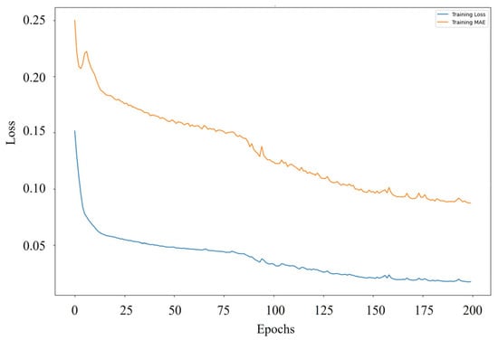 Training loss MSE (blue) and MAE (orange) trends over 200 epochs, indicating stable model convergence.