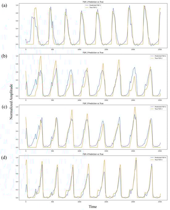 Figure 11 presents the comparison between predicted and ground-truth FSR pressure waveforms across the four sensing regions (heel, midfoot medial, midfoot lateral, and toe). The normalized pressure profiles reveal a high degree of temporal and amplitude alignment across multiple gait cycles. The predicted waveforms successfully reproduce major mechanical events such as HS, MST, and TO, demonstrating strong temporal fidelity. Minor discrepancies, primarily during rapid transition phases, are expected due to physiological variability, ambient noise, and the inherent electromechanical delay between neural activation and mechanical force output.