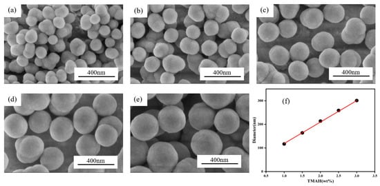 Figure 2a–e shows the SEM images of silica-encapsulated PtOEP particles prepared using 5 mg PtOEP with different TMAH mass fractions. All of the particles are monodispersed and exhibited spherical characteristics, which would contribute to the uniform photoluminescence of the films. It was statistically measured that the average particle sizes of the silica-encapsulated PtOEP prepared using 1.0, 1.5, 2.0, 2.5, and 3.0 wt.% TMAH were 117 nm, 164 nm, 214 nm, 259 nm, and 301 nm, respectively. The plot of silica-encapsulated PtOEP particle diameter versus TMAH additions shown in