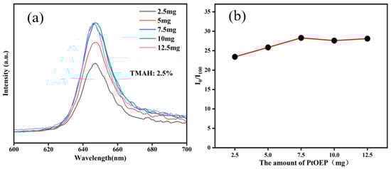 Figure 4. The results demonstrate that as the PtOEP content increases, the embedded PtOEP concentration in the films rises gradually, leading to the enhancement of photoluminescence intensity and oxygen sensitivity. However, no significant change occurs at higher PtOEP concentrations beyond 7.5 mg. The maximum I