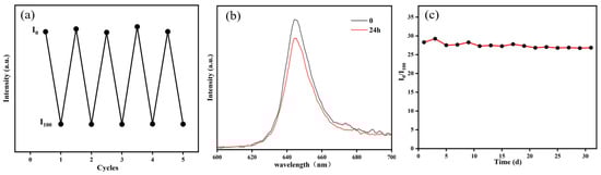 Figure 7b. After 24 h of UV irradiation, the thin film still maintained 85.7% of its photoluminescence intensity, demonstrating excellent photostability. To test the stability of the thin film in seawater, seawater collected from the East China Sea with a salinity of 3.1% (data source: Bulletin of the East China Sea Branch of the Ministry of Natural Resources, China) was first subjected to centrifugation and filtration to remove microorganisms, thereby avoiding microbial adhesion that could affect the film’s photoluminescence intensity and oxygen response capability. Subsequently, 30 mL of the treated seawater was transferred into a flask, and the film was immersed in it. The sample was then stored under dark conditions at 25 °C. The I