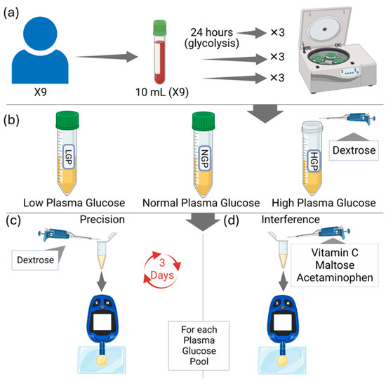 - Albloui, F.; John, J.; Alghamdi, O.; Alseraye, F.; Alqahtani, A.; Tamimi, W.; Albloshi, A.; Aldakheel, F.M.; Mateen, A.; Syed, R. Effect of hematocrit, galactose and ascorbic acid on the blood glucose readings of three point-of-care glucometers. Scand. J. Clin. Lab. Investig. 2022, 82, 563–570. [Google Scholar] [CrossRef]