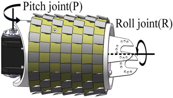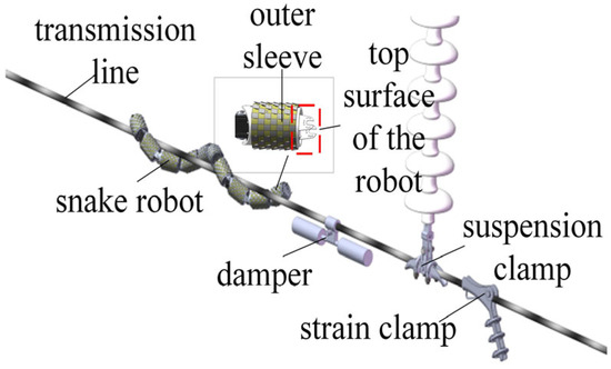 As illustrated in Figure 2, the snake robot comprises ten identical units connected in series, with each unit exhibiting two degrees of freedom: pitch (P) and roll (R). Its motion is the result of the combination of the joints, which give rise to an equal-pitch spiral shape. The robot rolling joints undergo periodic rotation, with the friction between the outer sleeve and the wire serving as the primary means of support for its operation on the transmission line.