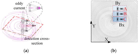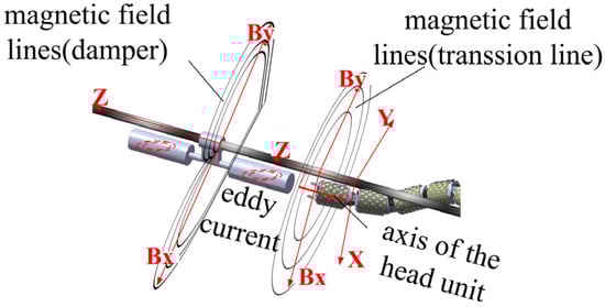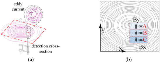 This inverted drop-shaped magnetic field distortion facilitates the detection of the By component. The By and Bx components can be detected simultaneously by placing the induction coil sensor in the position shown in Figure 9b. From region A to region C, the magnetic lines of inductance gradually contract, resulting in an increasing number of magnetic lines of inductance passing through the By induction coil sensor, while the angle between the magnetic lines of inductance and the sensor cross-section gradually decreases. At the same time, the angle between the magnetic lines passing through the Bx induction coil sensor and the sensor cross-section decreases, but the density of magnetic lines in the sensor cross-section increases accordingly. As a result, the values of By and Bx gradually increase from region A to region C, i.e., near the damper, and there is a significant increase in the detected values compared to those near the straight wire alone.