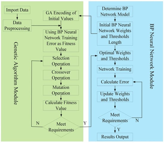 Here, amax and amin are the lower and upper bounds of x; g is the current iteration number; G is the maximum number of generations; and r is a random number between (0, 1). The fitness function of the new population is calculated. If the fitness meets the criteria or the maximum generations are reached, the evolution stops; otherwise, it returns to the selection phase of the genetic algorithm. Once the initial weights and thresholds optimised by the genetic algorithm (GA) meet the conditions, they are passed to the BP neural network for predictive computation.