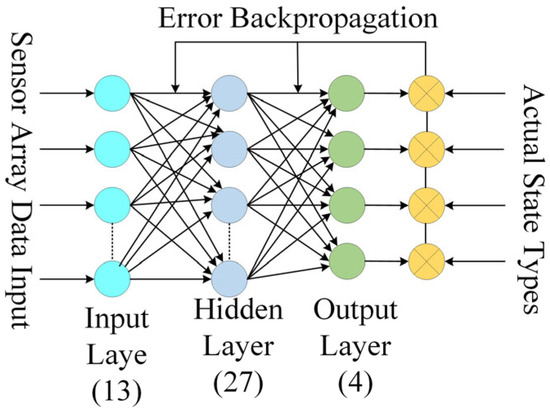 After setting the number of nodes in each layer of the BP neural network, 459 connection weights and 31 thresholds can be calculated, resulting in an individual encoding length of 490 for determining fitting types. Once the genetic algorithm’s population size is determined, the fitness function must be defined. The fitness value F of each individual in the population is calculated by using the initial weights and thresholds corresponding to the individual’s encoding in the BP neural network for prediction and then computing the absolute error between the output and expected data.