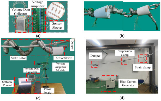 The experimental signal, collection devices, experimental environment, and the detection process. (a) Sensor and voltage amplifier data acquisition module; (b) the detection of strain clamps and suspension clamps; (c) physical experiment setup; (d) experimental environment.