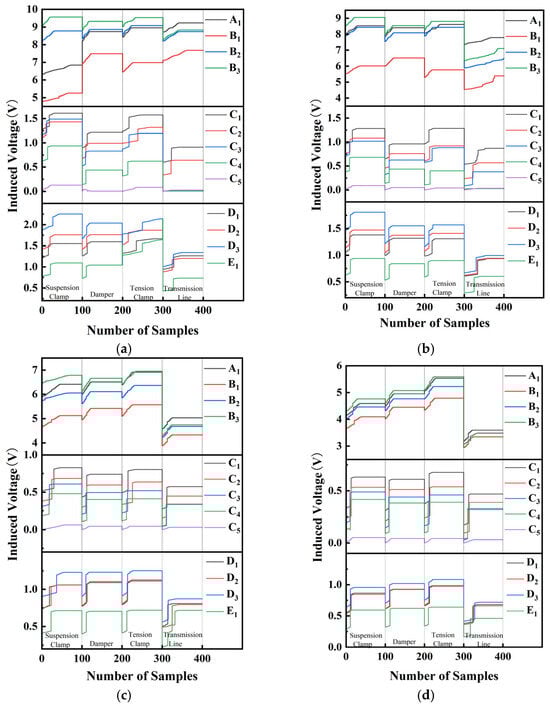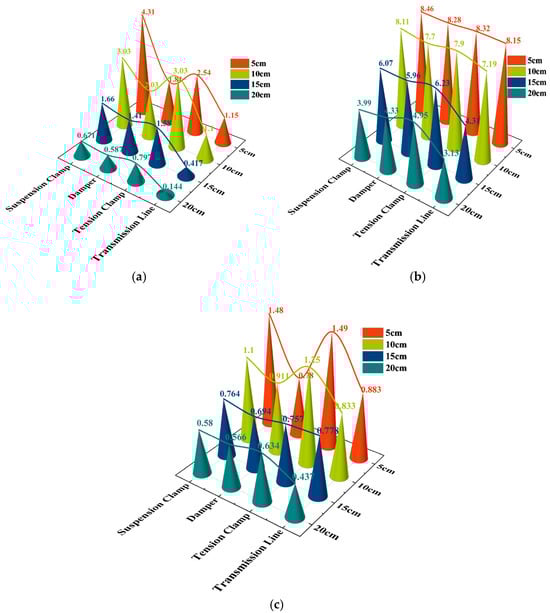 Figure 17 shows the processed raw data from the sensors, summarizing 100 sampling results for the transmission line and three types of conductor fittings (damper, suspension clamp, and tension clamp) at different detection distances.