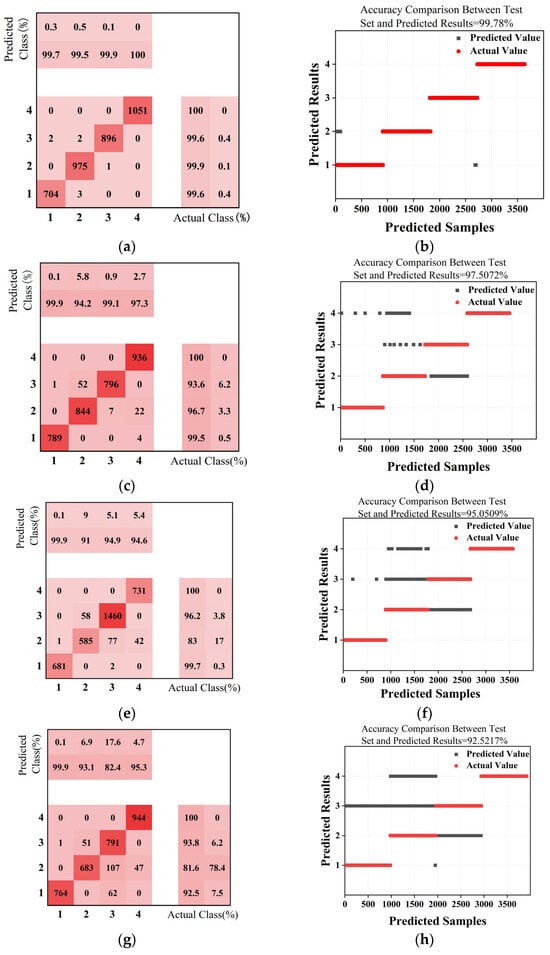 Output results: (a) confusion matrix for 5 cm prediction; (b) comparison of 5 cm prediction results; (c) confusion matrix for 10 cm prediction; (d) comparison of 10 cm prediction results; (e) confusion matrix for 15 cm prediction; (f) comparison of 15 cm prediction results; (g) confusion matrix for 20 cm prediction; (h) comparison of 20 cm prediction results.