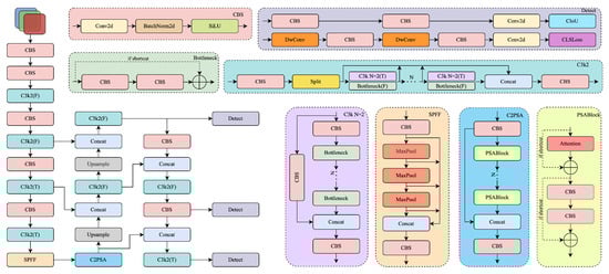 YOLOv11, introduced by Ultralytics in 2024 [], achieves an improved balance between speed and accuracy for real-time object detection through architectural updates across the backbone, neck, and prediction head. Figure 1 shows the main changes in the YOLOv11 backbone. The backbone replaces the older C2f block with a lightweight C3k2 module, reducing computation while maintaining robust feature representation. The SPPF module is retained for multi-scale context, and C2PSA spatial attention helps the model focus on dense regions.