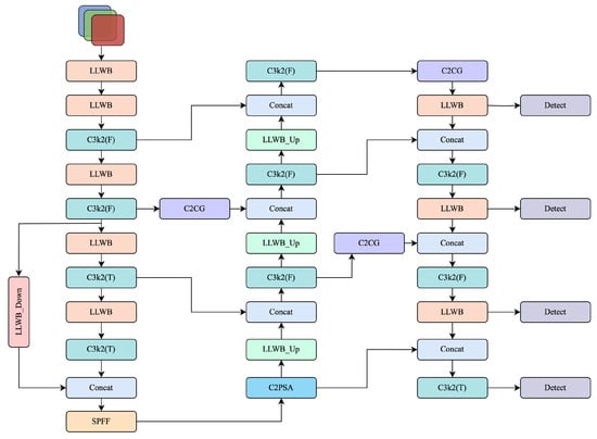 Overview of the proposed architecture. The design is based on YOLOv11, enhanced by frequency decomposition modules (LLWB, LLWB_Down, LLWB_Up), C2CG, and an additional shallow detection head.