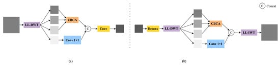 To enhance the network’s ability to model multi-scale structures, we introduce a complete frequency modeling path that spans both the backbone and neck stages. We implement this by replacing standard convolutions with learnable lifting wavelet transforms (LL-DWT and LL-IWT). We also design two cross-level frequency-guided modules, LLWB_Down and LLWB_Up, and supplement them with CBCA for subband-specific enhancement. The overall structures of LLWB_Down and LLWB_Up are shown in Figure 3.
