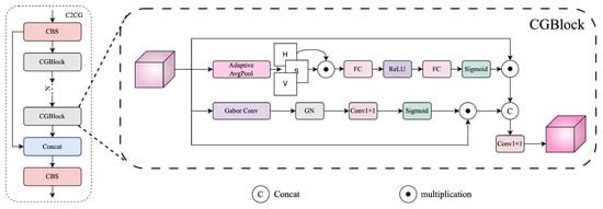 Specifically, the input feature first passes through a CBS module, followed by a CGBlock. A shortcut connection is established, and the output is processed by another CGBlock. The two outputs are then concatenated along the channel dimension and fused by a final CBS layer. This structure enhances feature expressiveness by integrating color and texture priors at multiple stages.
