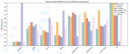 To better visualize the performance–efficiency trade-offs introduced by each component, we present a normalized bar chart in Figure 9, covering accuracy-related metrics (precision, recall, mAP), efficiency metrics (throughput), and model size (parameters). Each metric is normalized between 0 and 1, where higher is better, except for model size (normalized inversely). From this visualization, it is evident that the full model achieves the best overall balance across all dimensions.