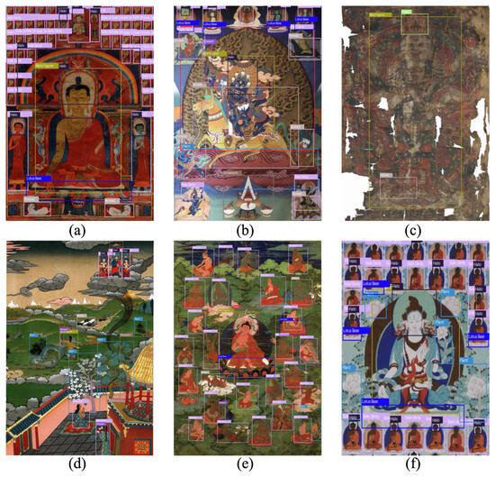Detection results on representative Thangka images: (a) single-color background Thangka, (b) multi-class richly decorated image, (c) severely damaged image, (d) narrative scene, (e) crowded character scene, (f) repeated deity structure. The model successfully localizes small and occluded targets while adapting to different layout complexities.