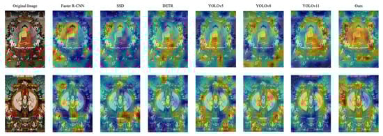 To further interpret the behavior and effectiveness of our proposed detector, we provide three types of visualizations: (1) sample detection results on diverse Thangka images, (2) Grad-CAM-based attention heatmaps, and (3) the confusion matrix of the proposed model.