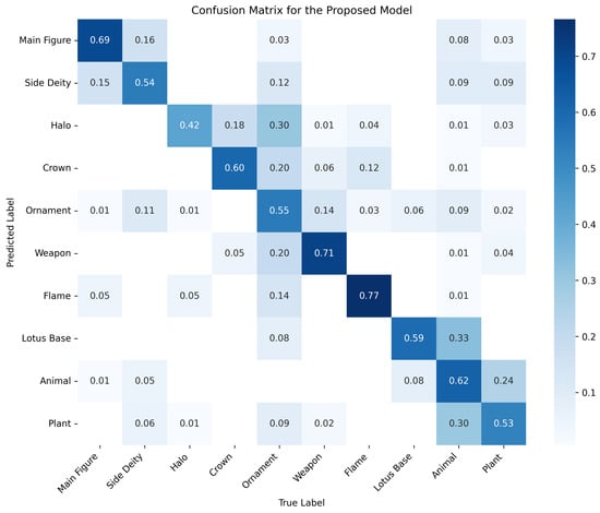 To provide a more quantitative and category-specific evaluation, Table 4 presents the per-class precision, recall, and F1-score computed from the confusion matrix. These metrics reveal both the strengths and the areas for improvement in each category, highlighting that the model achieves balanced performance across most major categories, while small or visually ambiguous classes (e.g., Ornament, Animal, Plant) remain more challenging.