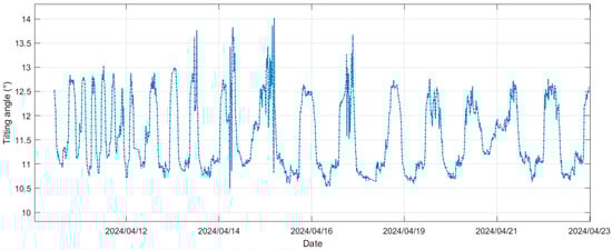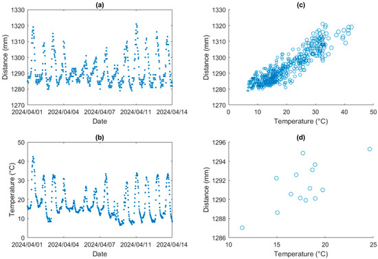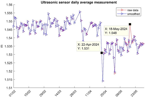 38]. Moreover, a deviation of about 1 cm in the ultrasonic sensor’s daily mean measurement is observed after 22 April 2024. This deviation coincides with the installation of new equipment on the pontoon in the week beginning 22 April 2024, which increased the pontoon’s weight and, consequently, its draft. As a result, the ultrasonic sensor’s distance measurements became slightly smaller.