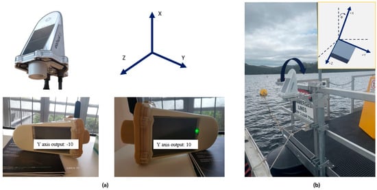 Figure 6 shows a snapshot and basic measurements of the system. The vertical measurement will be projected to an absolute water height using the ultrasonic sensor measurement. The GNSS collection session was set from 16:00:12 p.m. to 21:59:57 p.m. Coordinated Universal Time (UTC) at 15 s intervals. One device (id: F043) is installed on a fence on the dam embankment as the primary base station, assumed stable, with a 0.5 km distance to the other device (id: F044) mounted on the pontoon, as seen in