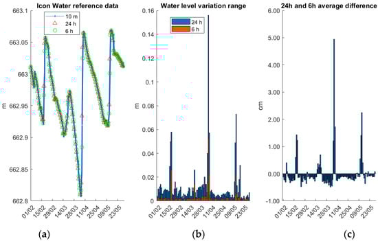 Figure 8b. Typically, the daily WSE variation (24 h) is less than 2 cm, but during the three noted rising periods, variations exceed 4 cm, with the 24 h variation peaking at 0.156 m on 7 April 2024. As expected, the 6 h variation is smaller than the 24 h variation. The mean 6 h range is 3 mm, while the 24 h range is 11 mm, allowing us to approximate the ratio of 6 h to 24 h. To assess the accuracy of using the 6 h average as representative of the reference daily solution, the difference between the 24 h and 6 h averages is presented in