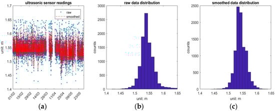 Figure 9a depicts the raw and smoothed sensor readings over the specified period, illustrating the fluctuations and outliers in the raw data due to factors such as the reflective angle of the ultrasonic wave or platform movement. Missing epochs of data are attributed to communication loss. The ultrasonic sensor raw data and smoothed data histograms are shown in