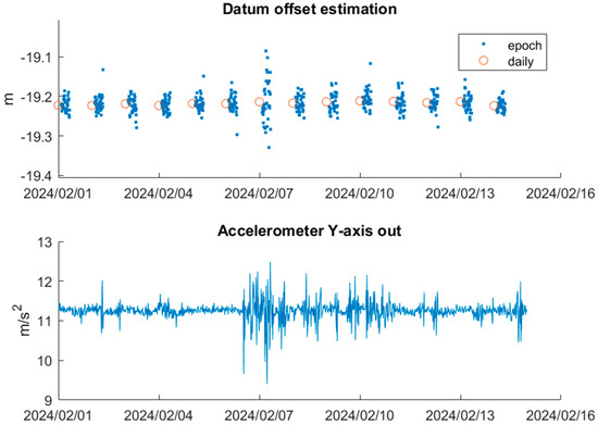 solutions remain stable throughout the two-week period. It is noted that on 7 February 2024, the epoch solutions show a significant deviation from other days, which is attributed to increased pontoon movement, as indicated by the accelerometer readings.