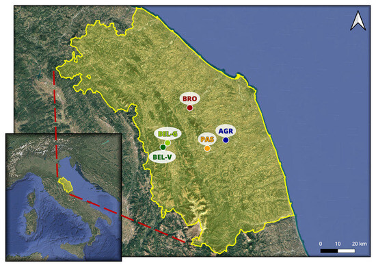 - Agenzia Servizi Settore Agroalimentare delle Marche (A.S.S.A.M.). Suoli e Paesaggi delle Marche; Errebi Grafiche Ripesi: Ancona, Italy, 2006. [Google Scholar]