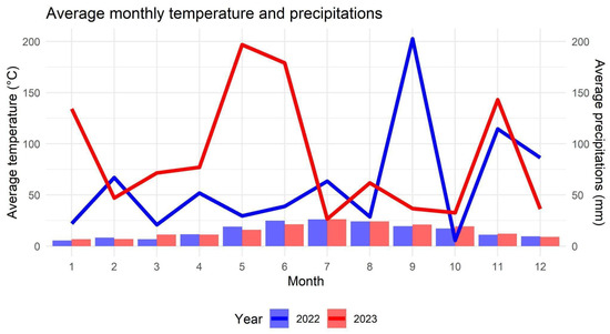 Graph of average temperature (°C) and precipitation (mm) in the years 2022 and 2023 obtained from 4 different meteorological stations, considering those closest to similar altitudes to the sites considered. The package “ggplot2” was used to generate the plot [36].