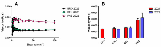 Viscosity (Pa s) vs. shear rate (s−1) plots for the analysis of wines (BRO, BEL, and PAS) produced in 2022 (A); comparison between viscosity (Pa s, Mean ± SD, n = 3) measured for the analyzed wines (AGR, BRO, BEL, and PAS) produced in 2021 and 2022 (B).