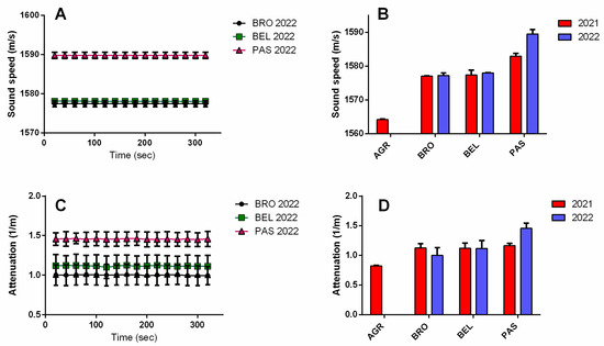 Sound speed (m/s) vs. time (s) (A) and attenuation (1/m) vs. time (C) plots for the analysis on wines (BRO, BEL, and PAS) produced in 2022; Comparison between sound speed (mean ± SD, n = 3) (B) and attenuation (mean ± SD, n = 3) (D) measured for the analyzed wines (AGR, BRO, BEL, and PAS) produced in 2021 and 2022.