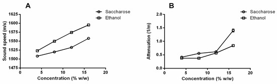 Variation in sound speed (m/s) (A) and variation in attenuation (1/m) (B) vs. concentration (% w/w) for standard solution of saccharose and ethanol at different concentrations (4, 8, 12, 16% w/w).