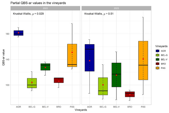 Boxplot of the distribution of the partial QBS-ar value obtained in each vineyard in 2022 and 2023. The package “ggplot2” was used to generate the plot [36].