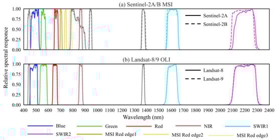 The Landsat-8 satellite, equipped with an operational land imager (OLI) and a thermal infrared sensor (TIRS), was launched in February 2013. It captures global surface information with a swath width of 185 km and a 16-day revisit cycle. The OLI includes nine reflective bands, i.e., blue, green, red, and near-infrared, and two shortwave infrared bands with a spatial resolution of 30 m for land applications. To ensure continuity in Earth surface observation, Landsat-9, as a sister satellite of Landsat-8, carrying a payload of OLI-2 and TIRS-2, was launched in September 2021. This allows the two satellites to collect highly consistent earth surface information, enabling the acquisition of remote sensing images for any global region every eight days at most []. Landsat imagery with the highest data quality through rigorous terrain and atmospheric correction is available for free from the U.S. Geological Survey (USGS) protocol EarthExplorer (https://earthexplorer.usgs.gov/ (accessed on 10 October 2024)).