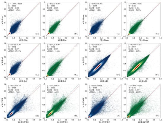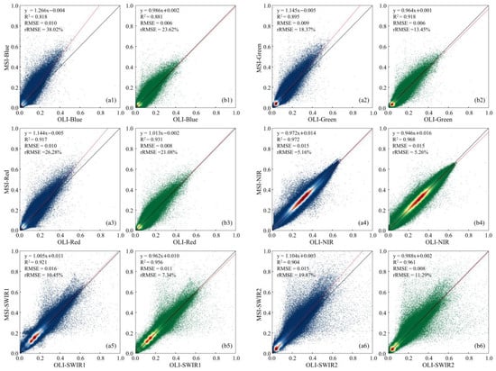 Scatterplots of BOA band reflectance in OLI vs. MSI with Sen2cor (a1–a6) and LaSRC (b1–b6) algorithms.