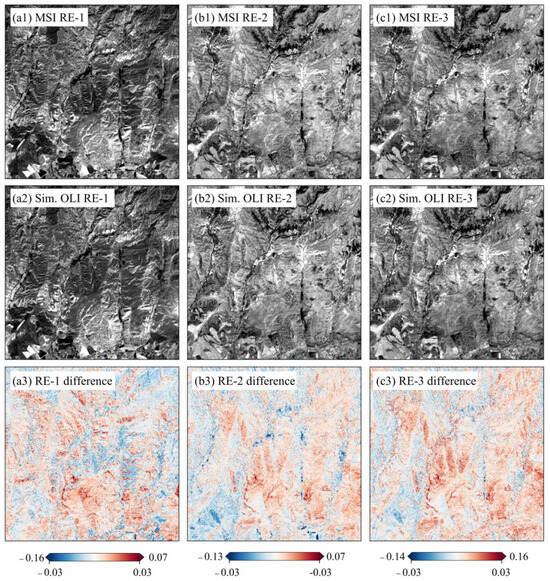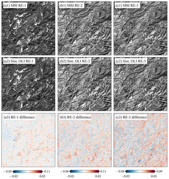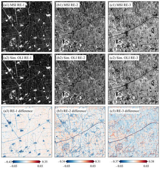 The Sentinel-2 L2A BOA reflectance data product was generated from the L1C data with an atmospheric correction algorithm tool called Sen2cor (https://step.esa.int/main/snap-supported-plugins/sen2cor/ (accessed on 10 October 2024)), whereas that of Landsat OLI L2A was generated with the LaSRC (Land Surface Reflectance Code v3.5.5) algorithm []. The L1C data of OLI and MSI were fed into the two algorithms to calculate their reflectance products, respectively. With Sen2cor, a direct comparison of the existing L2A data of the OLI and MSI shows considerable variations in their corresponding bands (Figure 3(a1–a6)). Better agreement between the OLI and MSI was characterized by the NIR (R2 = 0.972 and RMSE = 0.015) and SWIR1 (R2 = 0.921 and RMSE = 0.016) bands, while three visible bands (blue, green, and red) and the second shortwave infrared band (SWIR2) show the most variations relatively. Identity line deviations were the highest in the blue band, with a slope of 1.266 (Figure 3(a1)). Therefore, they could not be applied correctly to LRE reconstruction.