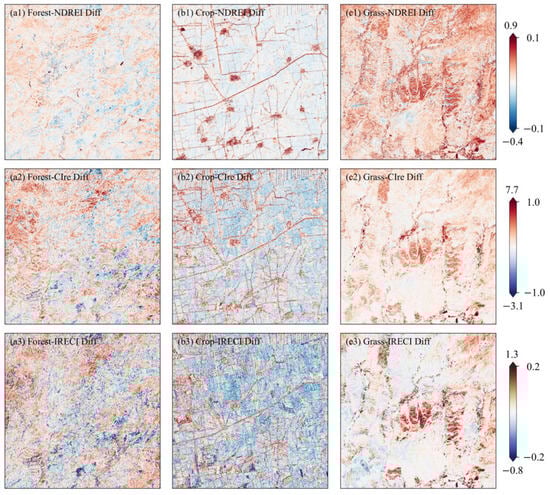 The percentage of pixels was calculated from the difference map of three REIs with respective thresholds (Table 6). There are over 98.7% of pixels in the NDREI, with an absolute difference of less than 0.1 for forestlands, croplands, and grasslands, respectively. Similarly, the number of pixels with an IRECI difference of less than 0.2 accounts for over 96% of each land cover. Different from NDREI and IRECI, a threshold of 1.0 was set for CIre difference. Pixels with differences from −1.0 to 1.0 account for over 97% of the ROIs in forestlands, croplands, and grasslands.