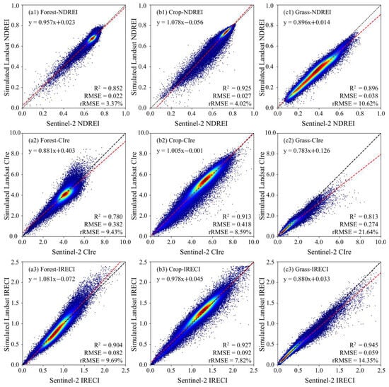 The scatterplots of NDREI, CIre, and IRECI derived from the simulated LRE vs. Sentinel-2 MSI.