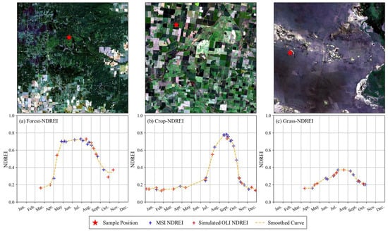 The proposed method not only improves the accuracy of red-edge simulation but also provides a theoretical basis for the cross-sensor simulation of red-edge bands and the derived vegetation indices. As a demonstration study, an attempt was made at three sites at forestland (55.642° N, 119.256° W), cropland (36.440° S, 142.858° E), and grassland (48.556° N, 118.539° E) across the globe (Figure 9). With our proposed RER method, the time-series images of Landsat and Sentinel-2 were acquired to investigate their synergy in the seasonal dynamics of vegetation growth in 2023. The fit lines of the NDREI derived from both reconstructed Landsat and Sentinel-2 data precisely delineate the phenological features of three typical vegetation covers (Figure 9a–c). This implies that the cross-sensor image stack of the reconstructed Landsat OLI and Sentinel-2 MSI is very valuable and desirable in quantifying the physiological properties of vegetation canopies and characterizing their phenological trajectories [,,].