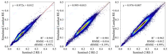 Four additional validation sites containing more diverse vegetation types were also investigated to further illustrate the practicability of the trained model in our study (see ROIs-15 to -18 in Table 1). We compared all pixels of Landsat OLI and Sentinel-2 MSI images containing forests, crops, and grasses. The total statistical results remain highly consistent for the three simulated red-edge bands (Figure 10), with an R2 > 0.9 and an rRMSE < 9.0%. However, it was found that the statistical errors were slightly larger than those derived from the single vegetation class shown in Table 4. This could be attributed to the limited input for our present model, which was trained from only 11 sites (Table 1). Combining the Sentinel-2 and Landsat missions enables more frequent global vegetation and environmental monitoring with high spatiotemporal variability. For our present reconstruction model, its representativeness, generality, and robustness need to be further improved in future applications. A possible solution might be to extend the spatial extent of data acquisition at global scales and to obtain as many Sentinel-2 images as possible, covering different seasons and vegetation types, to train the GBRT red-edge reconstruction model.