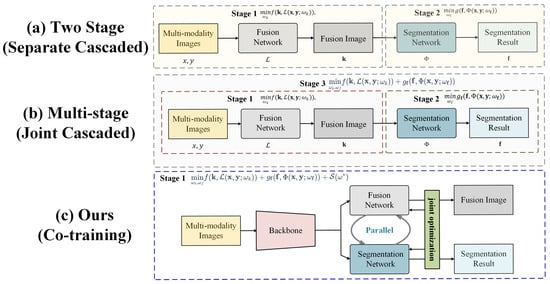 Secondly, in image fusion, the limited receptive field of CNNs, due to finite kernel sizes, causes local artifacts and hampers the preservation of fine-grained details, reducing visual quality. Additionally, the weight-sharing mechanism across regions makes CNNs prone to learning redundant feature representations, leading to feature redundancy. Finally, most existing methods treat image fusion and semantic segmentation as independent problems, overlooking the inherent correlation between the two. Although some studies [16,17] validate the effectiveness of fused images by using the results of image fusion as input for semantic segmentation or object detection, as shown in Figure 1, this cascading approach lacks effective strategies to fully utilize the inherent consistency between the two, failing to maximize their potential. At this point, multi-task learning (MTL) [18], which has been widely applied in the field of machine learning, inspired us. This approach aims to construct a unified model capable of simultaneously addressing multiple related tasks, with the goal of leveraging the underlying commonalities among tasks to enhance overall performance and reduce inefficiencies and redundancies during training [19,20]. In particular, MTL has demonstrated significant potential and promising prospects in dense prediction tasks such as semantic segmentation [21,22,23].